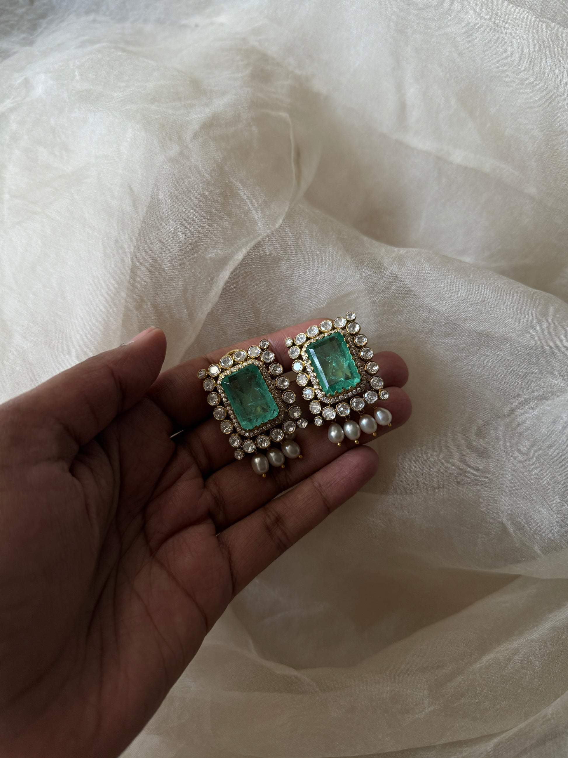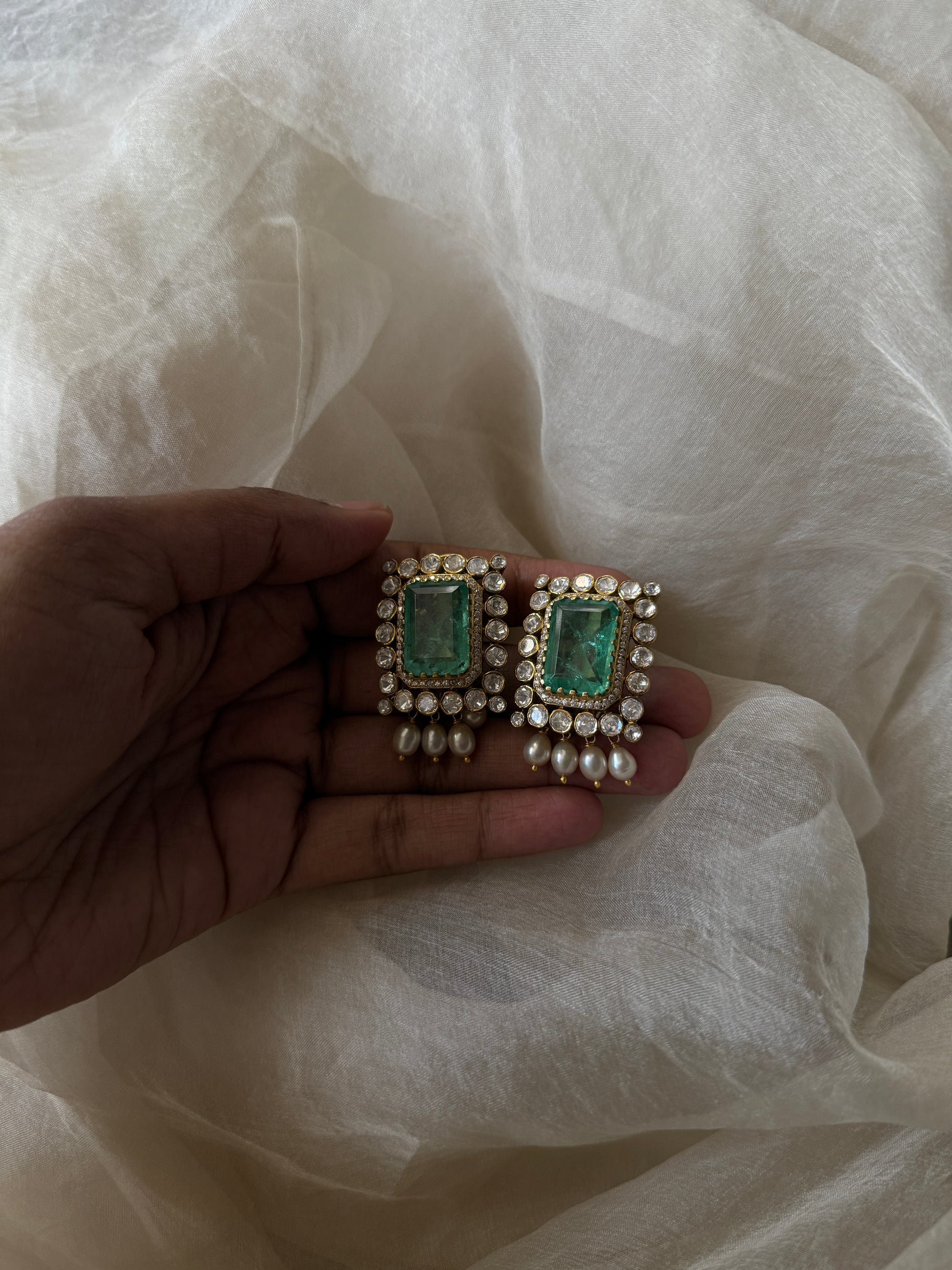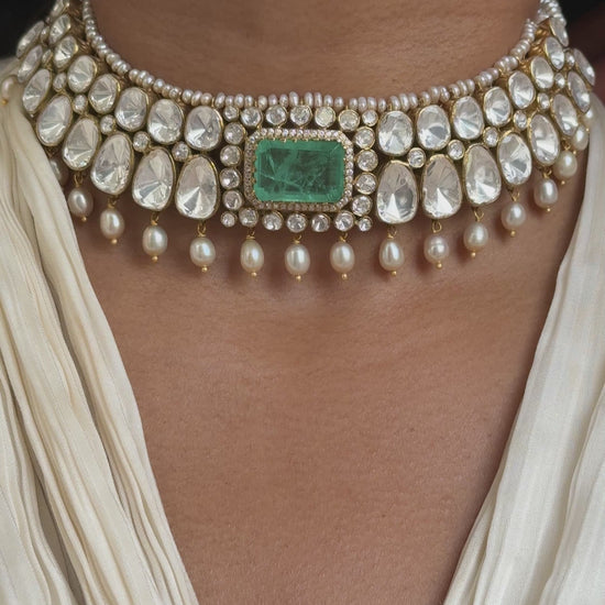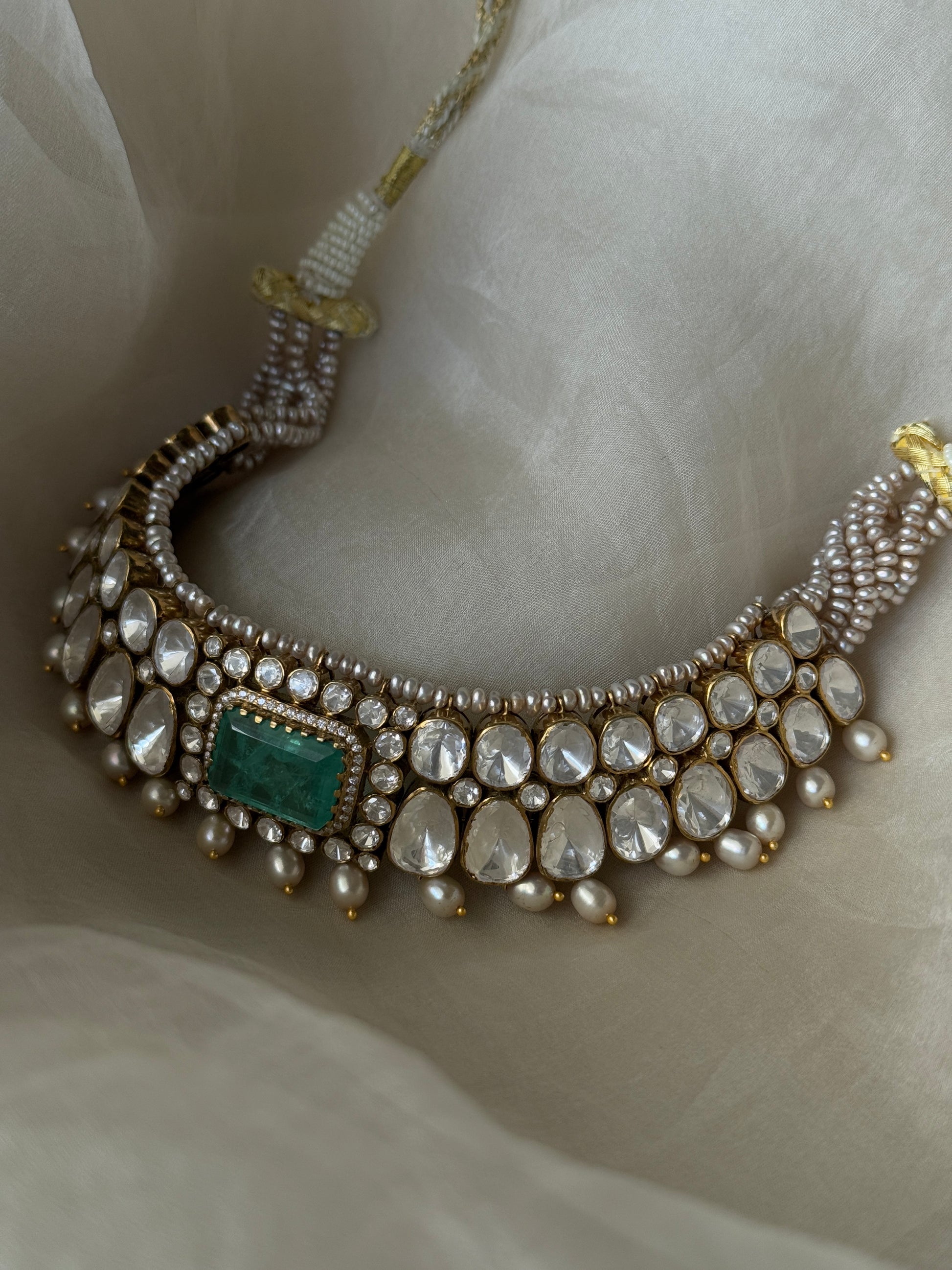 Lillian choker is composed of emerald doublet, moissanites, cubic zirconia and freshwater pearls.