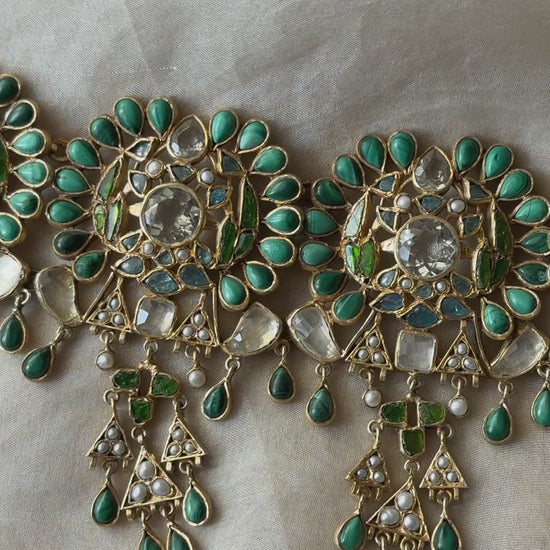 Artisanship: Each medallion is a complex arrangement of pear-shaped turquoise "petals" surrounding a central crystal heart. The inclusion of tiny seed pearls and green enamel accents adds a layer of artisanal richness.